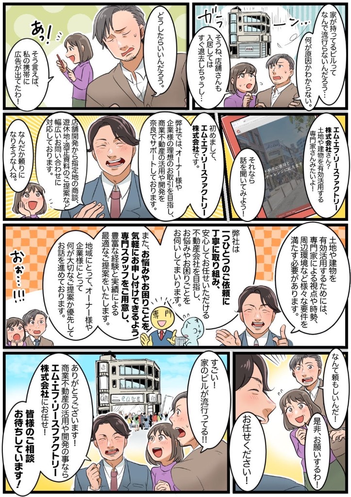 商業不動産を中心にロードサイド店舗を扱っております、エム・エフ・リースファクトリー株式会社です。事業用不動産を扱っている内容のマンガが完成されました。